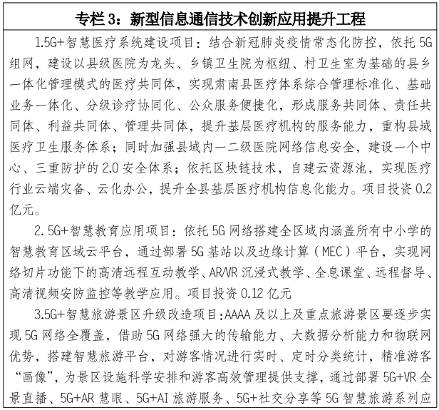 (三)促進(jìn)各行業(yè)數(shù)據(jù)信息技術(shù)應(yīng)用發(fā)展。促進(jìn)跨行業(yè)大數(shù)據(jù)融合創(chuàng)新。打破體制機(jī)制障礙,打通數(shù)據(jù)孤島,創(chuàng)新合作模式,培育交叉融合的大數(shù)據(jù)應(yīng)用新業(yè)態(tài)。支持電信、移動(dòng)、聯(lián)通等信息化基礎(chǔ)好的基礎(chǔ)通訊企業(yè)率先開展跨領(lǐng)域、跨行業(yè)的大數(shù)據(jù)應(yīng)用,培育大數(shù)據(jù)應(yīng)用新模式。加快實(shí)施“5G+醫(yī)療”“5G+教育”“5G+旅游”等行動(dòng),在教育醫(yī)療、文化旅游、交通運(yùn)輸?shù)戎攸c(diǎn)領(lǐng)域開發(fā)具有品牌優(yōu)勢(shì)的行業(yè)特色應(yīng)用軟件,帶動(dòng)應(yīng)用軟件產(chǎn)業(yè)發(fā)展,不斷提升服務(wù)質(zhì)量和水平。推進(jìn)空間信息技術(shù)在災(zāi)害預(yù)警、資源調(diào)查、農(nóng)業(yè)監(jiān)測(cè)和生態(tài)保護(hù)等領(lǐng)域廣泛應(yīng)用,通過數(shù)據(jù)融合創(chuàng)新應(yīng)用,創(chuàng)造和延展一批新服務(wù)、新應(yīng)用、新產(chǎn)品,培育和發(fā)展一批新技術(shù)、新模式,帶動(dòng)和培育數(shù)字金融、數(shù)字醫(yī)療、數(shù)字交通、數(shù)字旅游等數(shù)字經(jīng)濟(jì)發(fā)展。