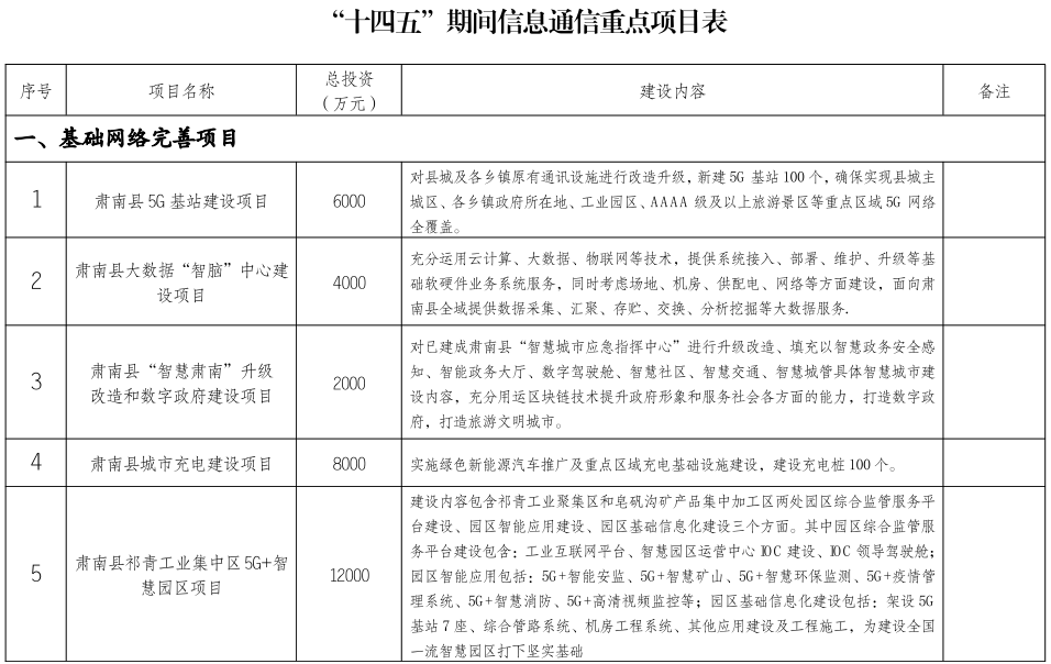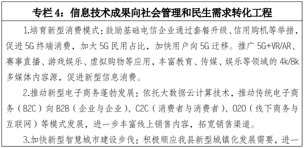 ——基礎(chǔ)設(shè)施進(jìn)一步完善。完成互聯(lián)網(wǎng)骨干節(jié)點(diǎn)升級(jí),提升網(wǎng)絡(luò)流量疏通能力,有線光纖入戶率達(dá)到100%,由鄉(xiāng)鎮(zhèn)至縣城平均上聯(lián)帶寬達(dá)到20Gpbs。實(shí)現(xiàn)5Gpbs,由縣城至市級(jí)平均上聯(lián)帶寬達(dá)到縣城主城區(qū)、各鄉(xiāng)鎮(zhèn)政府所在地、工業(yè)園區(qū)、AAAA級(jí)及以上旅游景區(qū)等重點(diǎn)區(qū)域5G網(wǎng)絡(luò)全覆蓋,到2025年建成開通5G基站100個(gè)以上。完成政府、學(xué)校、企事業(yè)單位外網(wǎng)網(wǎng)站及商業(yè)網(wǎng)站系統(tǒng)的IPV6升級(jí)改造。