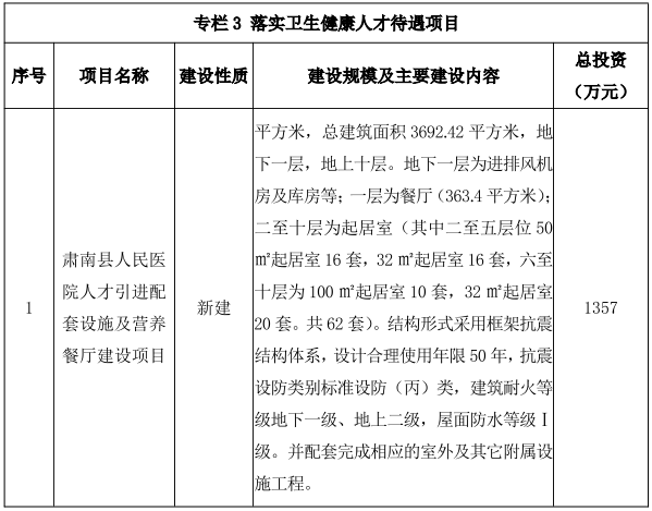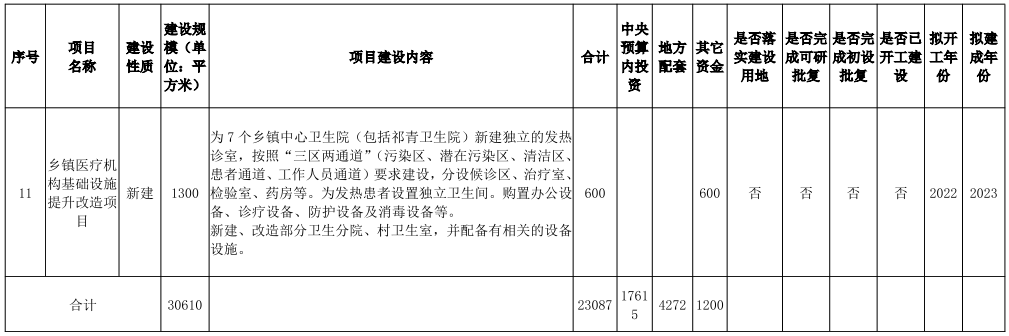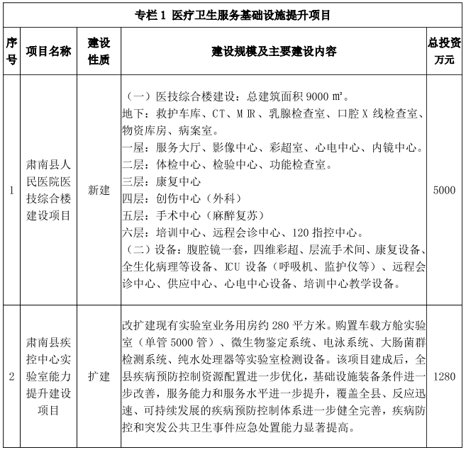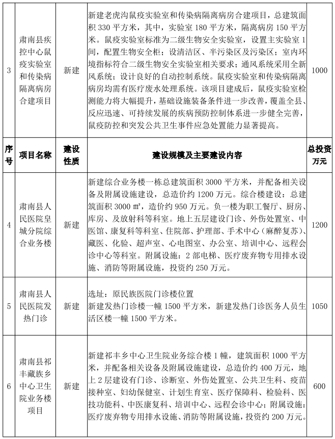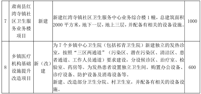 (一)強化醫療衛生基礎設施建設。優化現有醫療衛生資源結構,加大公立醫療衛生機構建設力度,提升設施設備現代化水平。實施公共衛生防控救治能力提升工程,圍繞縣域醫學中心和救治中心,建設縣醫院醫技綜合樓。實施全方位全生命周期健康保障工程,推進婦女兒童健康服務能力建設、職業病防治體系建設、精神衛生和心理健康能力建設。嚴格預檢分診,醫療衛生機構要設置規范的發熱門診、腸道門診、醫廢暫存、醫療廢水處理等設施,加快補齊疾病預防控制體系短板,建設重點區域鼠疫防控監測站點。