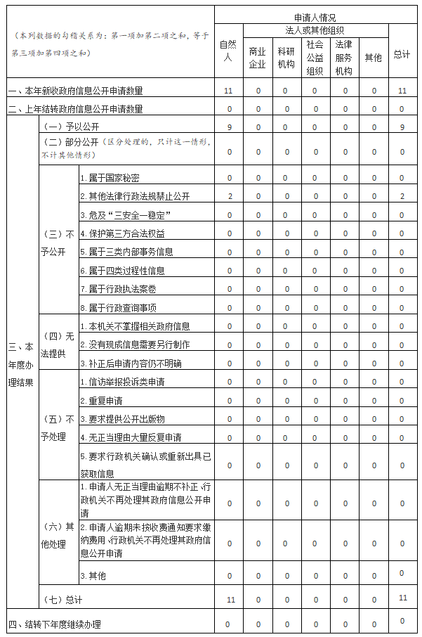 (二)依申請公開情況。進一步規范登記、審核、辦理、答復、歸檔等工作流程,提高依申請公開便民服務水平。對依申請公開相關規定和要求進行全面梳理和規范,針對基層疑難復雜辦件,采取電話溝通,業務指導等形式,督促其提升辦理質量。2024年收到和處理依申請公開11件,均已辦結。